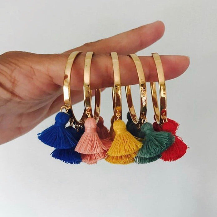 Gorgeous gold hoops with cotton tassels, they are bound to get you lots of compliments!
