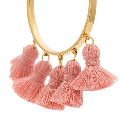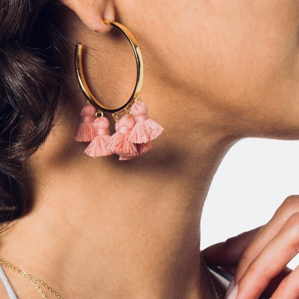 Gorgeous gold hoops with cotton tassels, they are bound to get you lots of compliments!