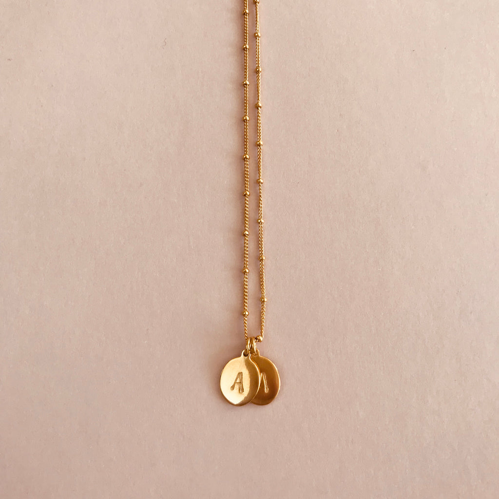 This popular necklace has 2 oval discs on a delicate ball chain. The discs measure 11x13mm and is stamped with your letter of choice. A gem of a necklace that you will wear every day and give you lots of compliments!