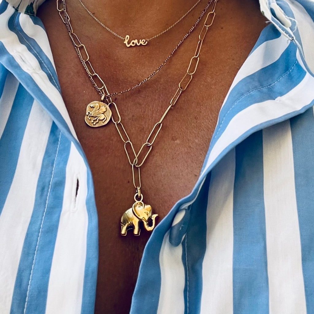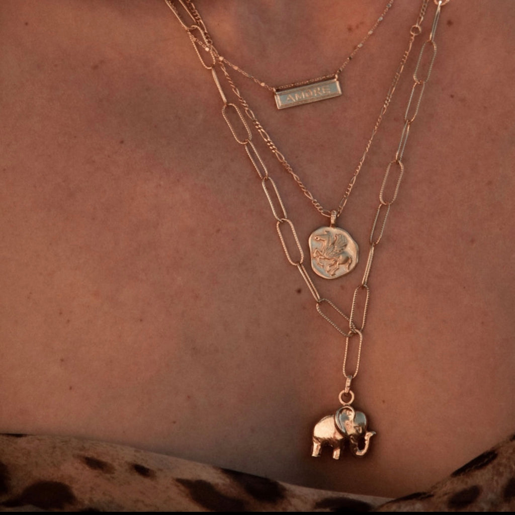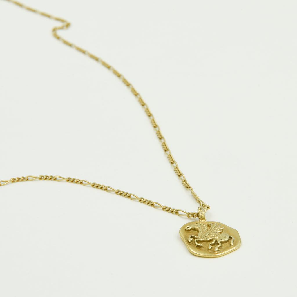 Inspired by an old coin featuring Pegasus, an Ancient Greek mythological creature. Hangs beautifully on a pretty figaro chain.