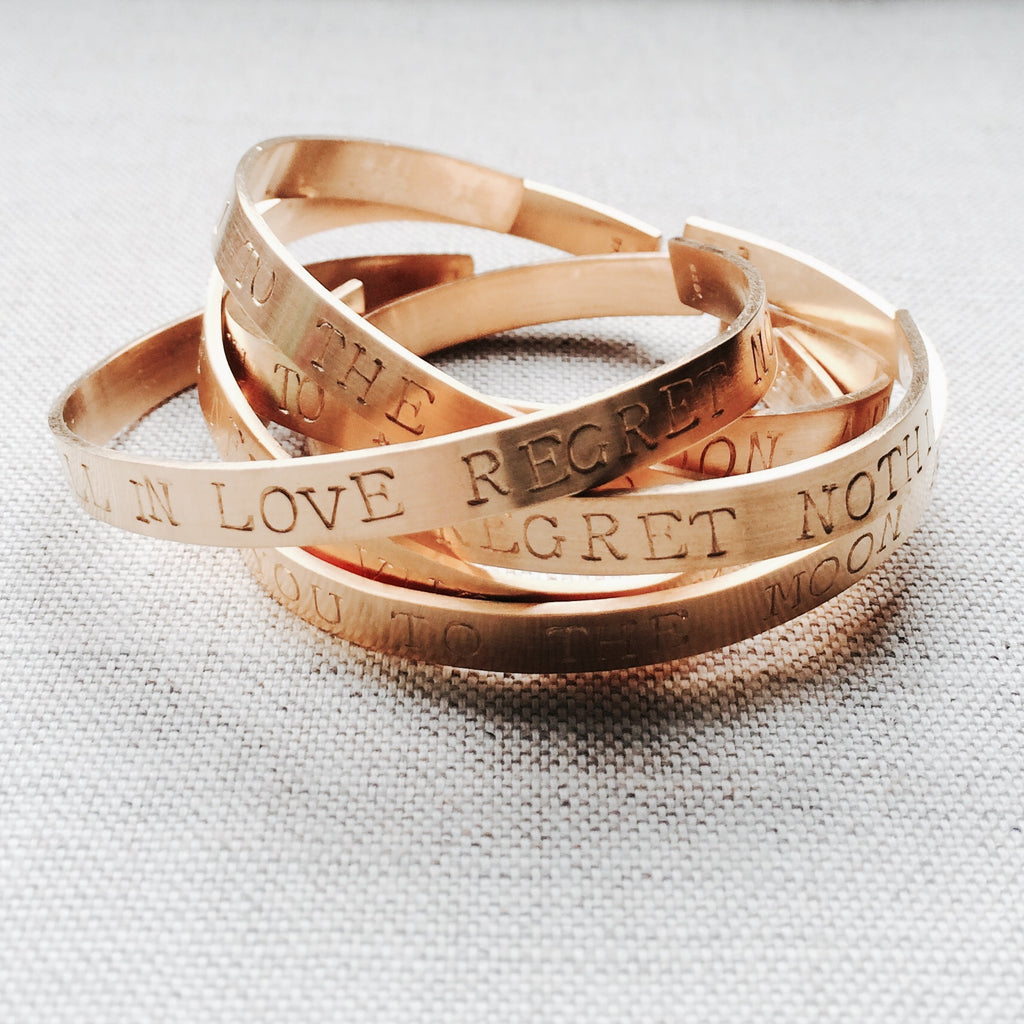 Bangles are hand made and stamped so letters may not be perfectly aligned, this is part of its character and not considered a flaw.